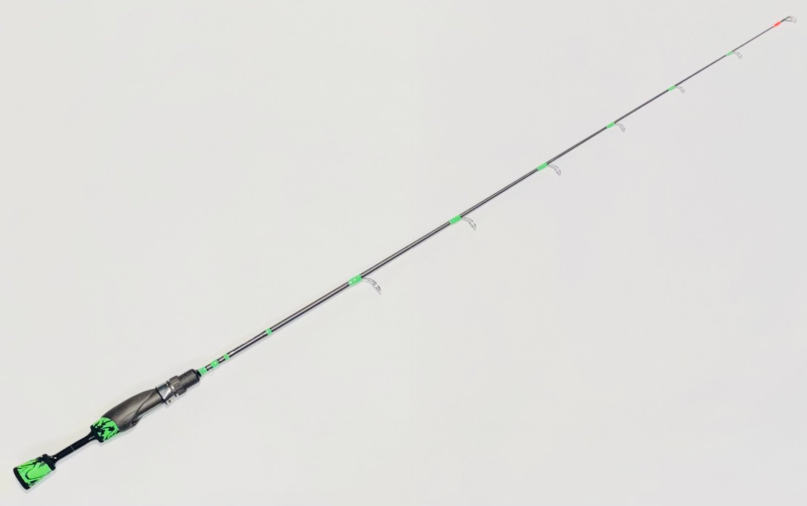 Handcrafted Dark Grey 40″ Medium-Fast Spinning Ice rod. Split Green with Black swirls PU grip & a palm swell seat, designed for comfort. Built on fiberglass blank! Excellent choice for strength & versatility in cold weather. Silver Stainless Steel Ring(SSR) guides great for braided line and cold weather applications. Guides wrapped with Lime green thread with grey inlays & neon orange on tip to act as a visual strike indicator. Ideal for Trout, Walleye, medium size Pike & other similar size game fish. Designed for a spinning ice reel or 500-1000 series spinning reel. Â