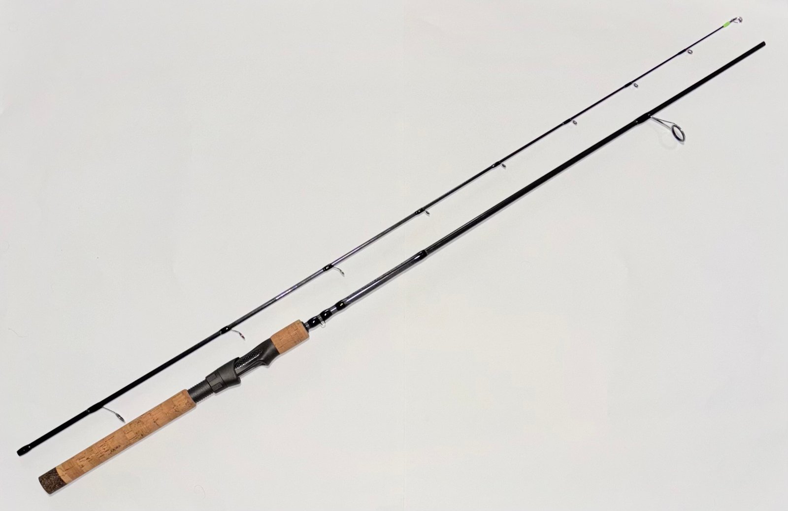 Handcrafted Spinning 6’9″ 2pc Nano Carbon M-F Spinning rod. Full Cork size 17 dark grey OVS handle, concept style Titanium Oxide ceramic ring(TiO2) guides with black thread & metallic green trim and inlays. With its Nano Carbon material for strength & sensitivity along with an OVS reel seat this  rod makes an excellent and comfortable choice for the average angler for a versatile rod to target medium size Walleye and other similar size game fish. Designed for 2000-2500 series spinning reel.